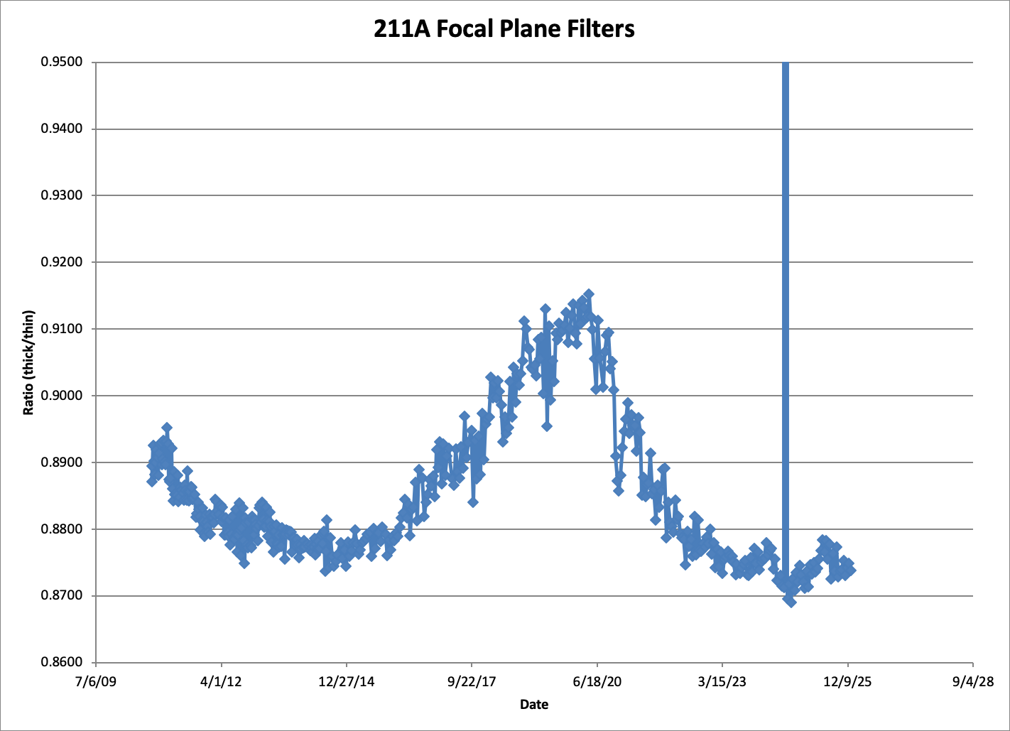 The general step up starting around September 2011 due to pinhole hits that cause super-saturation in the front filter check calibration.