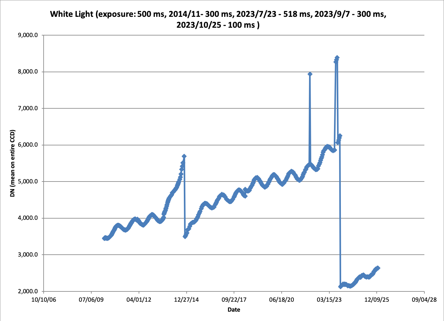 Decline in DATAMEAN: Jake says, bright limb burns in the CCD and results in lower sensitivity. (11/29/2012)